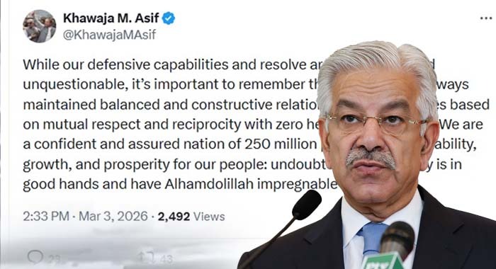 Pakistan’s Defence Minister, Khawaja Asif, has reaffirmed the country’s unwavering defensive strength while emphasizing Pakistan’s long-standing commitment to balanced and constructive international relations.
